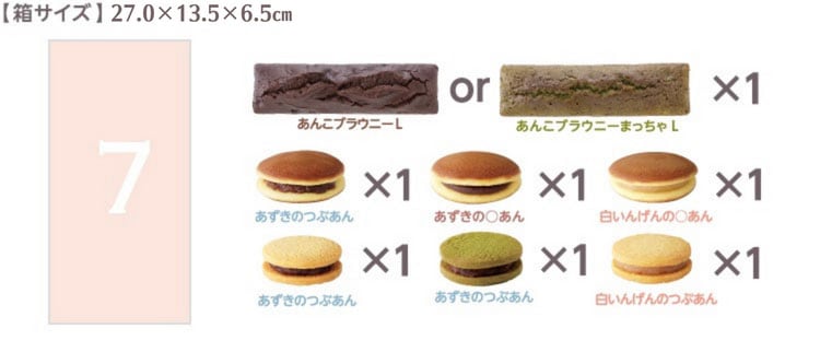 商品名 あんこブラウニーL・たいよう・つき詰合せ7個 箱サイズ 27.5×13.5×6.5cm 商品内容 【あんこブラウニーL】