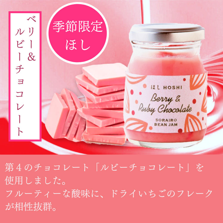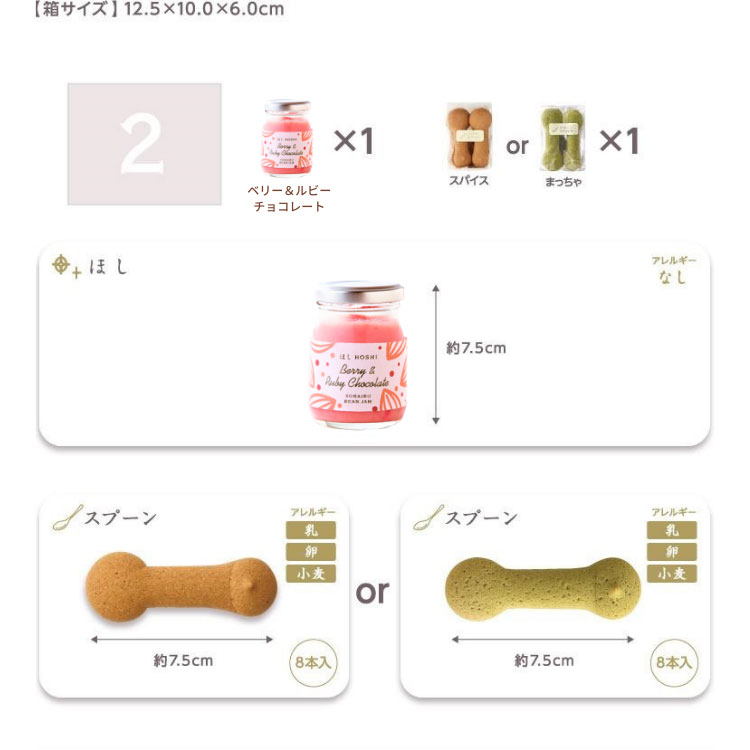 商品名 季節限定ほしベリー&ルビーチョコレート&スプーンクッキーセット 箱サイズ 12.5×10.0×6.0cm 商品内容 【ほし(瓶詰あん)】