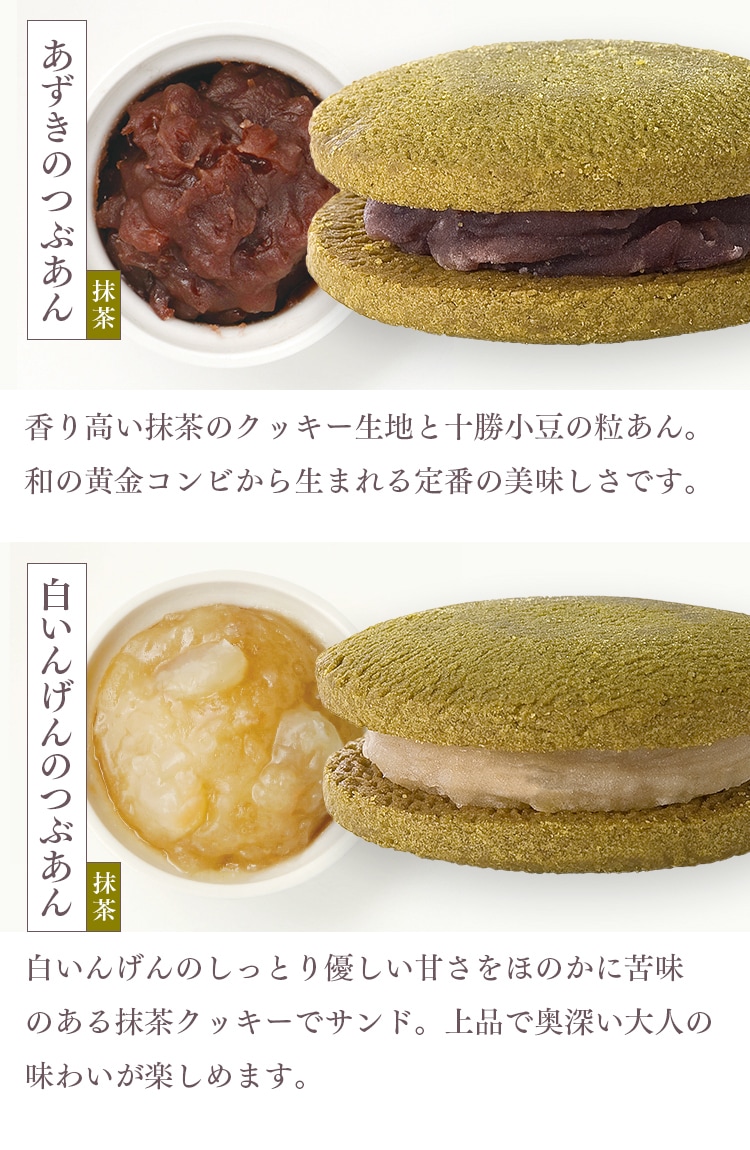 白いんげんのしっとり優しい甘さをほのかに苦味のある抹茶クッキーでサンド。上品で奥深い大人の味わいが楽しめます。