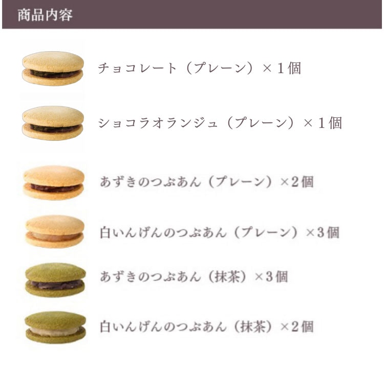 砂糖(国内製造)、小麦粉、小豆、マーガリン、還元水飴、アーモンドパウダー、卵加工品、バター、牛乳、ココアパウダー、食塩/寒天、(一部に乳成分・小麦・卵・アーモンド・ゼラチンを含む)