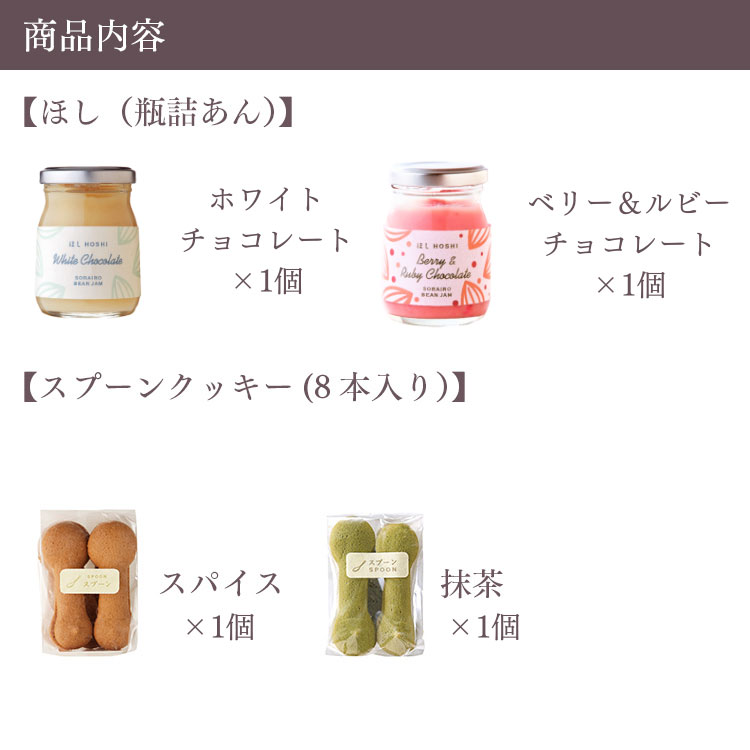 商品名 季節限定ほしホワイトチョコレート✕ベリー&ルビーチョコレート入りスプーンクッキー2袋セット 箱サイズ 24.0×10.0×6.0cm 商品内容 【ほし(瓶詰あん)】