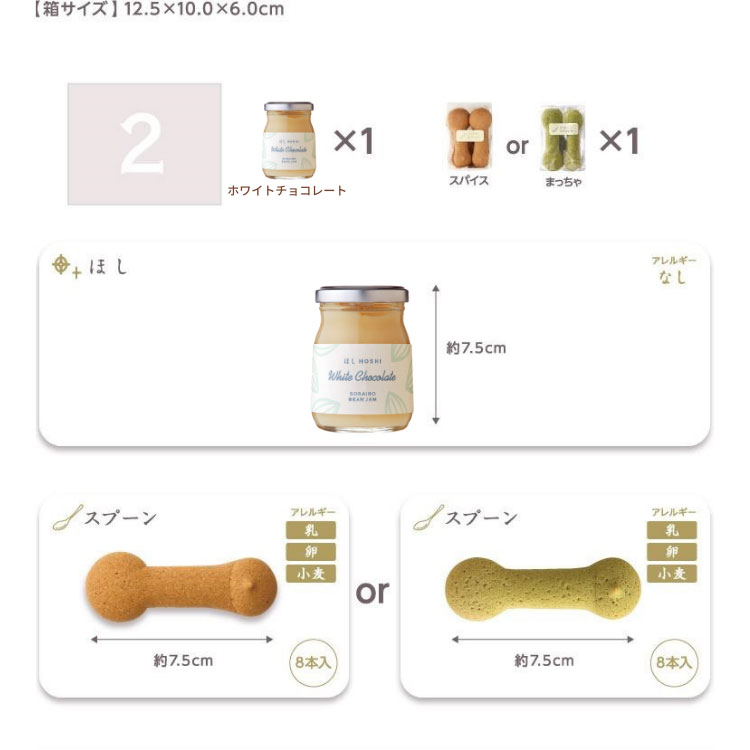 商品名 季節限定ほしホワイトチョコレート&スプーンクッキーセット 箱サイズ 12.5×10.0×6.0cm 商品内容 【ほし(瓶詰あん)】