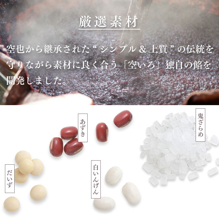 ※空いろEC店は工場より商品を直送しており店舗とはお日持ちが異なりますのでご了承下さい。保存方法 直射日光、高温多湿を避け25度以下の涼しい所で保存してください。 発送温度帯 常温 発送の目安 ご注文より4日営業日以降に発送 製造者 (有)空也 東京都中央区銀座6-7-19 製造所 東京都足立区竹の塚5-36-20