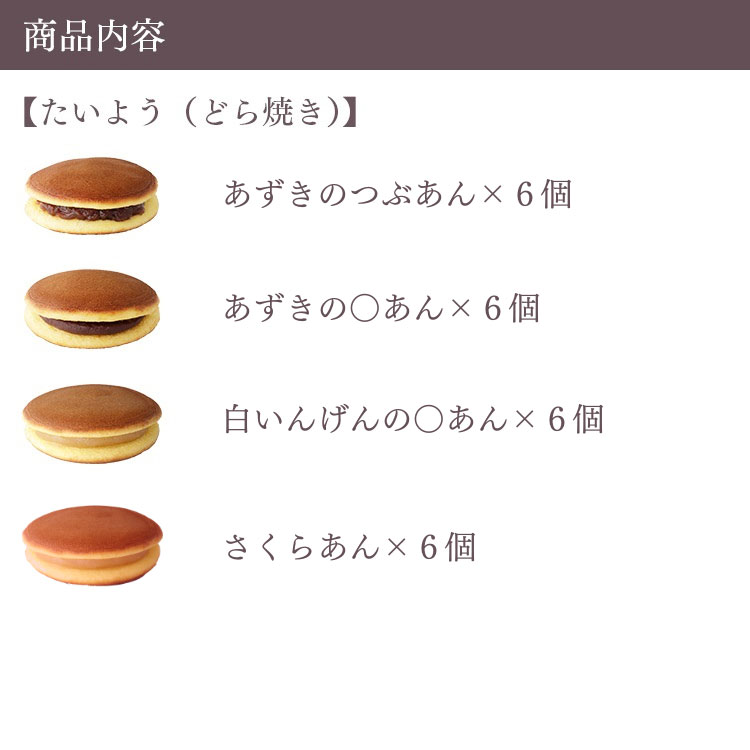 商品名 季節限定さくらあん入りたいよう24個セット 箱サイズ 35.0×19.5×6.5cm 商品内容 【たいよう(どら焼き)】