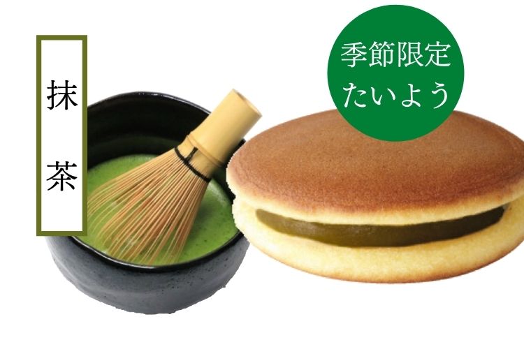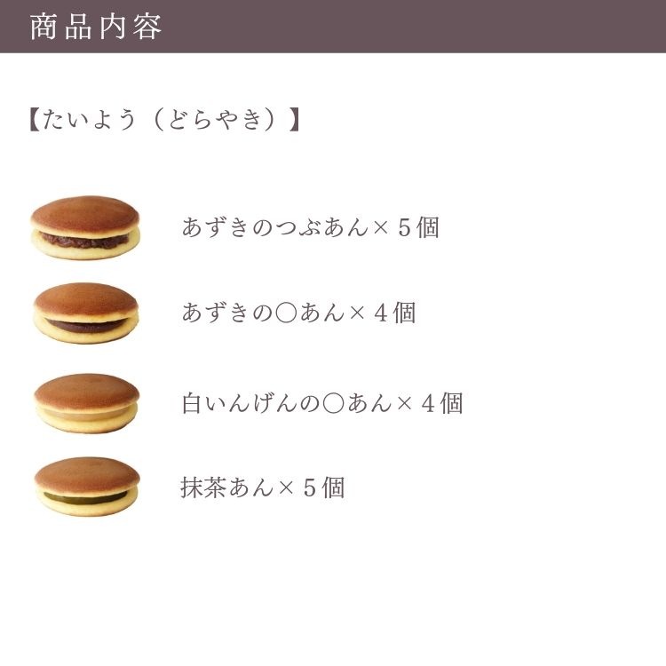 商品名 季節限定まっちゃあん入りたいよう18個セット 箱サイズ 27.5×20.0×6.5cm 商品内容 【たいよう(どら焼き)】